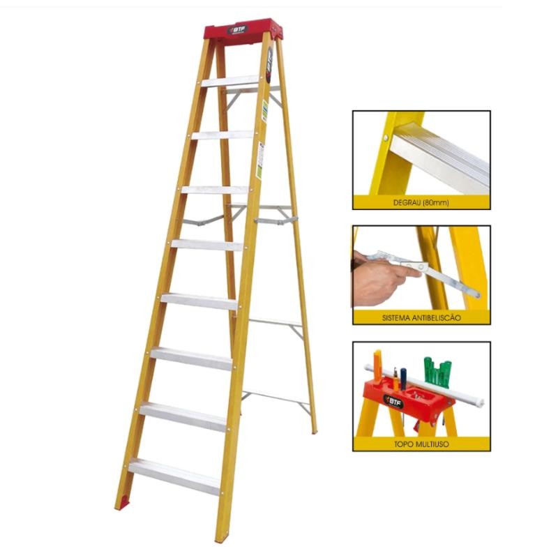 A escada fibra Botafogo tesoura 8 degraus é a escolha ideal para quem busca máxima segurança, resistência e estabilidade em trabalhos em altura. Indicada tanto para uso residencial quanto profissional, ela é amplamente utilizada em serviços elétricos, manutenção predial, instalações, pintura, limpeza e atividades que exigem um equipamento confiável e durável. Fabricada em fibra de vidro de alta qualidade, a escada fibra Botafogo tesoura 8 degraus oferece um grande diferencial em relação aos modelos metálicos: o isolamento elétrico. Essa característica torna o produto especialmente recomendado para eletricistas e profissionais que atuam próximos a redes elétricas, proporcionando mais segurança durante o uso.